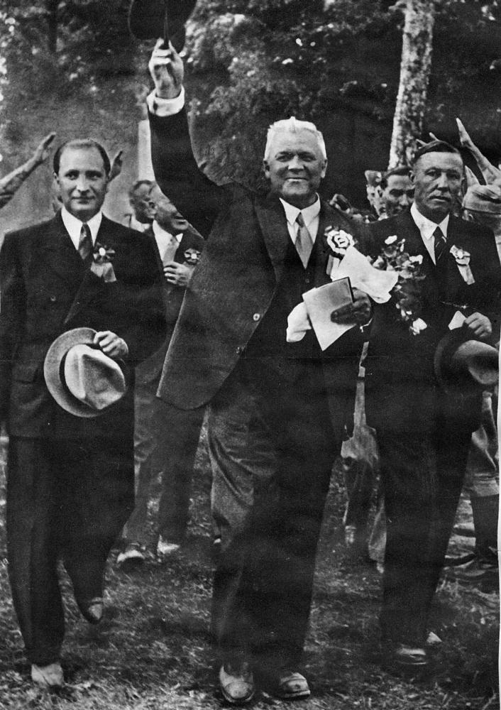 Pirmo Dziesmu svētku 75 gadu Atceres Dziesmu svētki Dikļu muižas parkā. Valdības pārstāvju sagaidīšana svētku estrādē. No kreisās: 1. sabiedrisko lietu ministrs Alfrēds Jēkabs Bērziņš, 2. Latvijas Valsts un Ministru prezidents Kārlis Ulmanis, 3. svētku Rīcības komitejas priekšsēdētājs Jānis Eduards Millers. Laikraksta fotoreprodukcija.