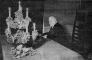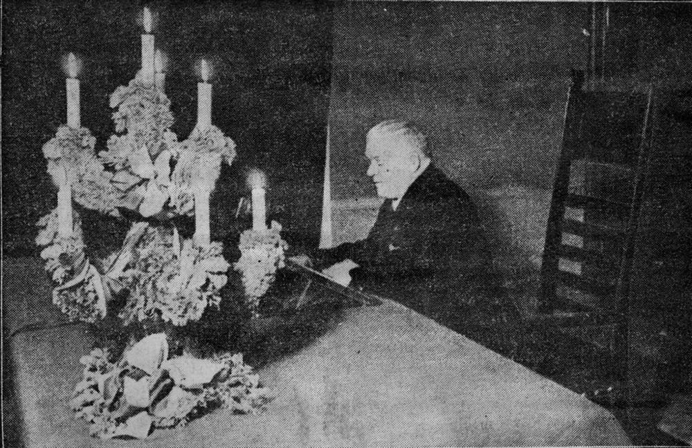 Latvijas Valsts un Ministru prezidents Kārlis Ulmanis no Rīgas pils pa radio uzrunā vakarēšanas dalībniekus Lugažos, kuri pulcējušies Ziemassvētku priekšvakarā savā pamatskolā. Laikraksta fotoreprodukcija.