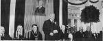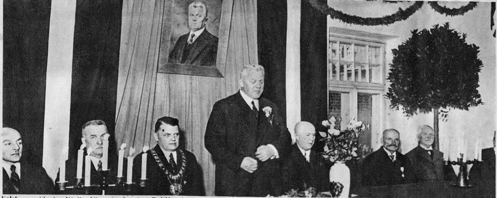 Latvijas Valsts un Ministru prezidents Kārlis Ulmanis uzstājas Baltijas lauksaimnieku biedrības 40 gadu jubilejas svinībās Valmierā. No kreisās: 3. Valmieras pilsētas mērs (1934-1940), agronoms Jānis Ruģēns, 4. Kārlis Ulmanis, 5. Baltijas lauksaimniecības biedrības priekšnieks Hermanis Enzeliņš. Laikraksta fotoreprodukcija.