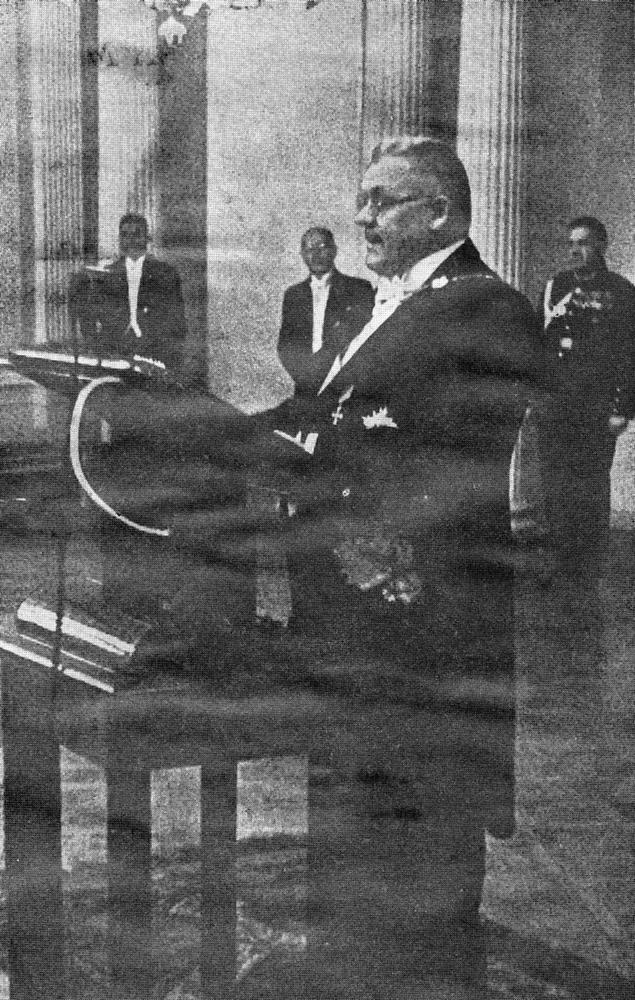 Latvijas Republikas Valsts un Ministru prezidents Kārlis Ulmanis uzrunā tautu Latvijas Neatkarības proklamēšanas gadadienā. Laikraksta fotoreprodukcija.