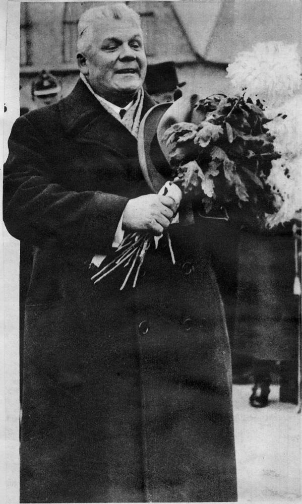 Latvijas Republikas Valsts un Ministru prezidents Kārlis Ulmanis, ar japāņu hrizantēmām, uzrunā Olaines un Mārupes pagasta iedzīvotājus. Laikraksta fotoreprodukcija.