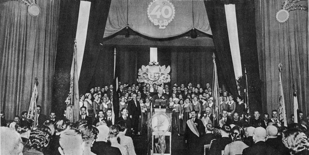Latvijas Valsts un Ministru prezidents Kārlis Ulmanis uzstājas Baltijas lauksaimnieku biedrības 40 gadu jubilejas svinībās Valmierā, Latviešu biedrības zālē. Laikraksta fotoreprodukcija.