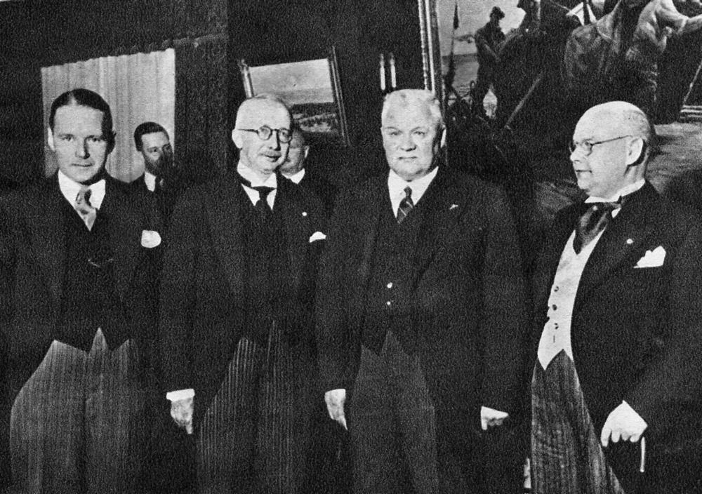 Tikšanās Somijas ārlietu ministra Rūdolfa Holsti vizītes laikā Rīgā. No kreisās: 1. ārlietu ministrs Vilhelms Munters, 2. Rūdolfs Holsti, 3. Latvijas Valsts un Ministru prezidents Kārlis Ulmanis, 4. Somijas sūtnis Latvijas Republikā Eduards Jalmars Palins. Laikraksta fotoreprodukcija.
