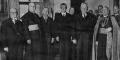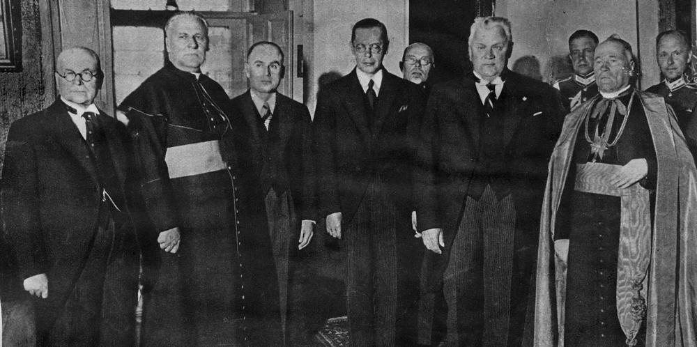 Liepājas katoļu bīskapa Antonija Urbša uzticības zvēresta pieņemšana pie Latvijas Valsts un Ministru prezidenta Kārļa Ulmaņa, Rīgas pilī. 1. rindā no prezidenta pa kreisi: 1. Valsts kancelejas direktors Dāvids Rudzītis, 2. izglītības ministra biedrs (1934-1940), Rīgas Sāpju Dievmātes baznīcas garīdznieks Jāzeps Čamanis, 3. Prezidenta pārstāvis baznīcu un konfesiju departaments direktors E. Dimiņš, 4. iekšlietu ministrs Vilis Gulbis, 5. Kārlis Ulmanis, 6. Antonijs Urbšs. 2. no kreisās: 1. Kārļa Ulmaņa sekretārs J. Grandavs, 2. Rīgas pils komandants (1936-1940), pulkvedis, dzejnieks (pseidonīmi Rūdis, Raimonds) Raimonds Bebris, 3. Valsts prezidenta adjutants pulkvežleitnants Miervaldis Lūkins. Laikraksta fotoreprodukcija.