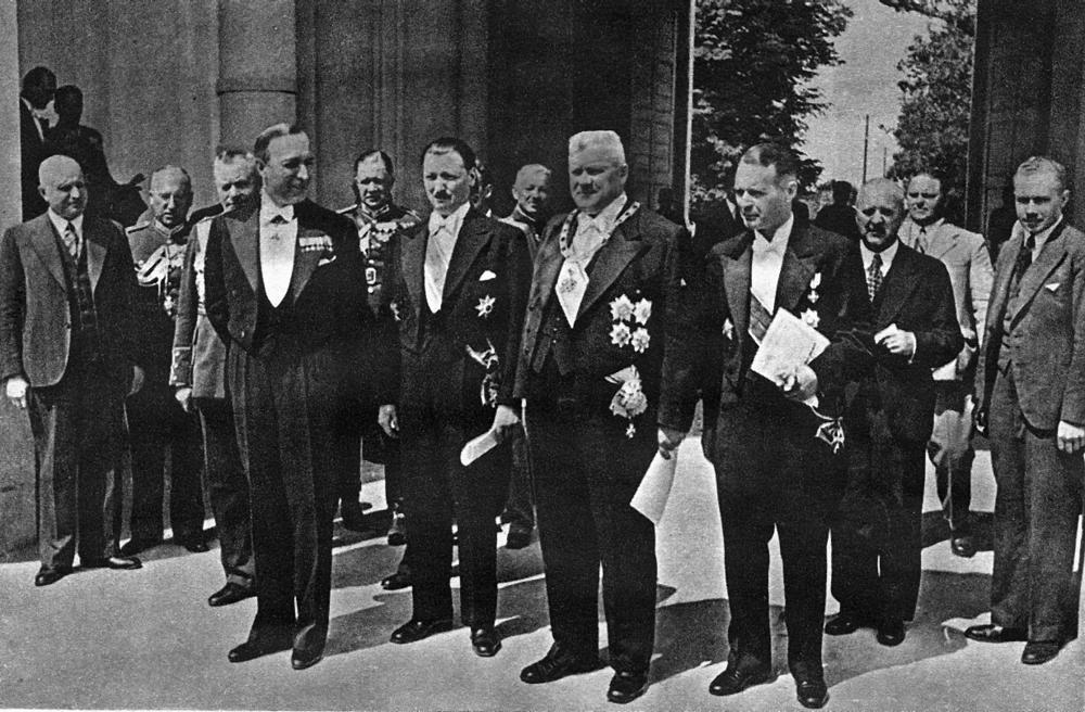 Latvijas Valsts un Ministru prezidents Kārlis Ulmanis pieņem ārvalstu sūtņus Viestura piemiņas pilī (tagad Jelgavas pils). No kreisās: 1. Polijas sūtnis Ježijs Tadeušs Klopotovskis, 2. Čehoslovākijas sūtnis P. Baračeks-Žakjē, 3. Kārlis Ulmanis, 4. ārlietu ministrs Vilhelms Munters. Laikraksta fotoreprodukcija.