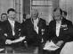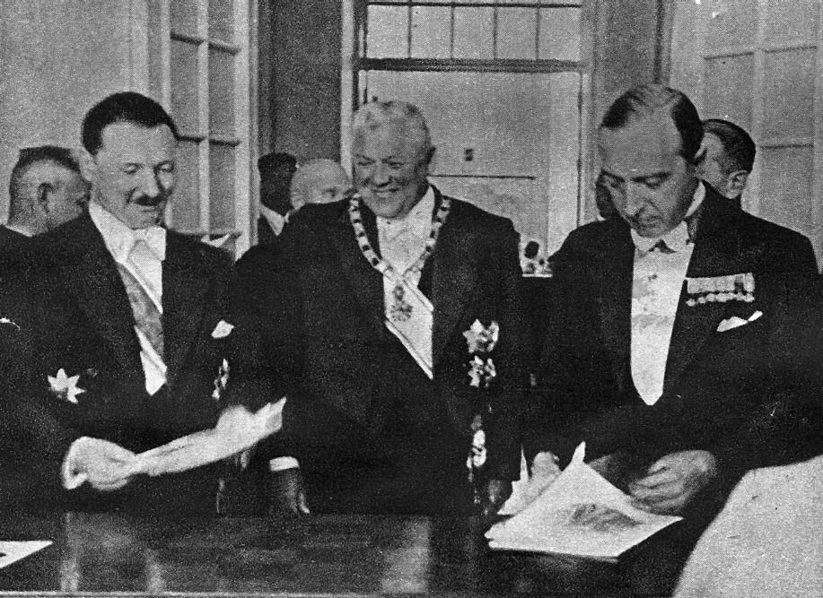 Latvijas Valsts un Ministru prezidents Kārlis Ulmanis pieņem ārvalstu sūtņus Viestura piemiņas pilī (tagad Jelgavas pils). No kreisās: 1. Čehoslovākijas sūtnis P. Baračeks-Žakjē, 2. Kārlis Ulmanis, 3. Polijas sūtnis Ježijs Tadeušs Klopotovskis. Laikraksta fotoreprodukcija.