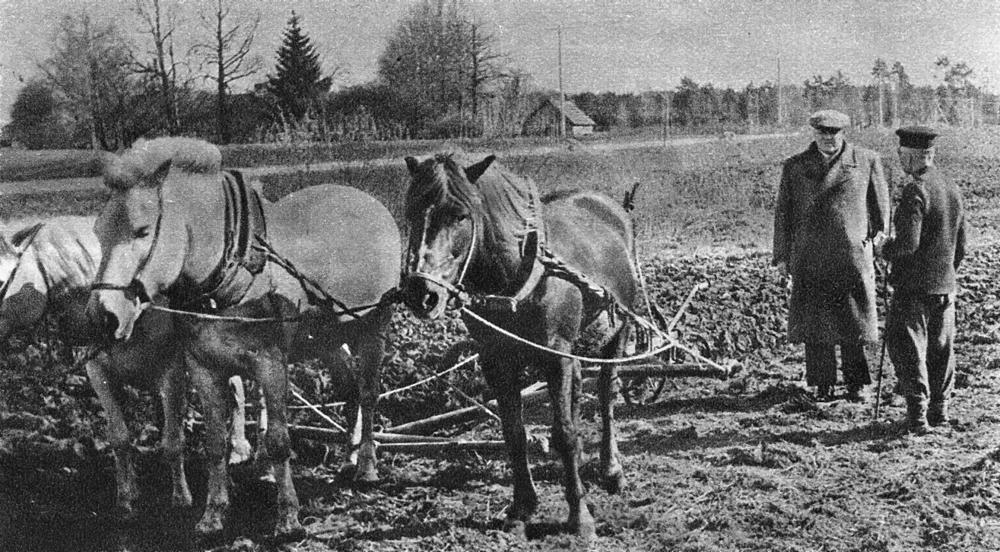 Latvijas Valsts un Ministru prezidents Kārlis Ulmanis (no kreisās) sarunājas ar Zālītes pagasta "Klibju" māju saimnieku, izbraukuma laikā pa Zemgali. Laikraksta fotoreprodukcija.