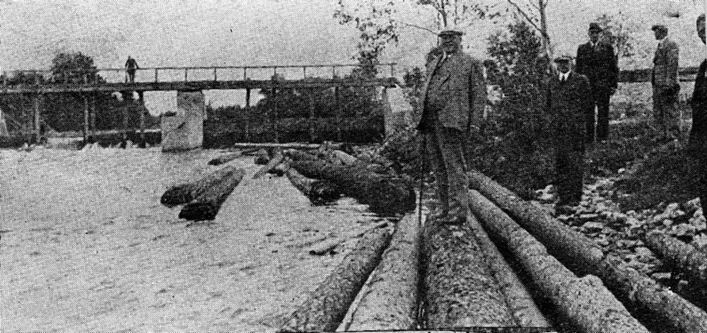 Latvijas Valsts un Ministru prezidents Kārlis Ulmanis (priekšplānā) Gaujas krastos, izbraukuma laikā pa Vidzemi. Laikraksta fotoreprodukcija.