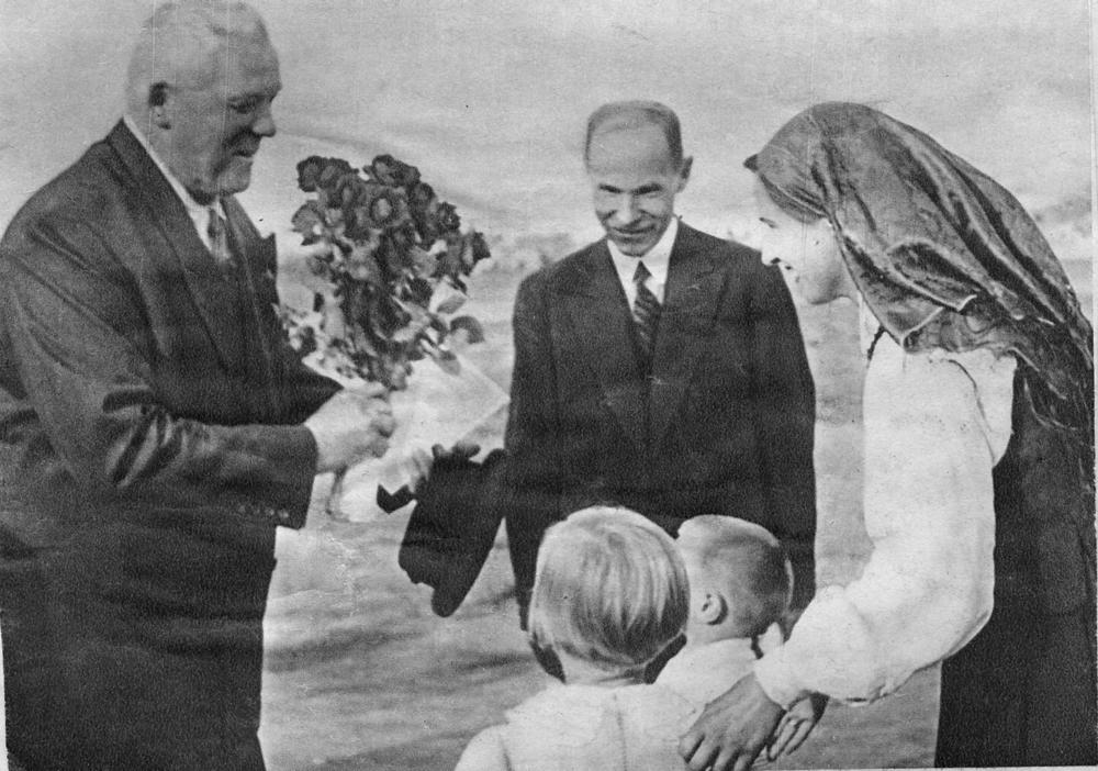 Latvijas Valsts un Ministru prezidentu Kārli Ulmani sveic mazie 4. Vienības brauciena dalībnieki. No kreisās: 1. Kārlis Ulmanis, 2. 4. Vienības brauciena rīcības komitejas priekšsēdētājs, Starptautiskās Olimpiskās komitejas loceklis (1926-1947) Jānis Dikmanis. Laikraksta fotoreprodukcija.