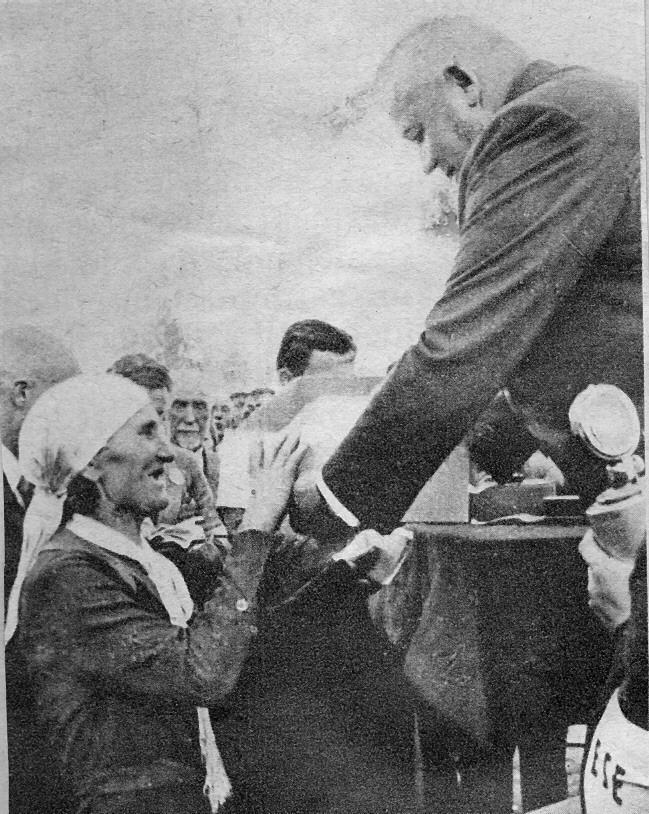 Latvijas Valsts un Ministru prezidents Kārlis Ulmanis apbalvo ilggadējos laukstrādniekus. Trešajos Pļaujas svētki. Laikraksta fotoreprodukcija.