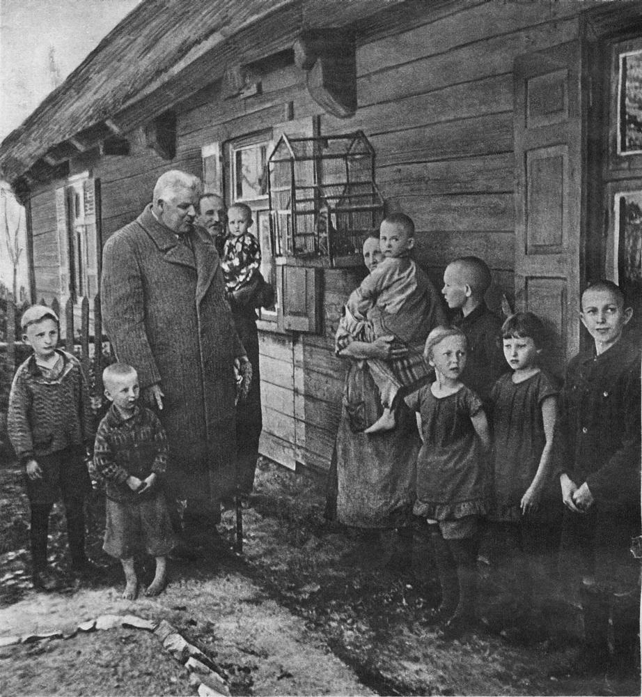 Latvijas Valsts un Ministru prezidents Kārlis Ulmanis jaunsaimnieka Roberta Puriņa daudzbērnu ģimenes vidū Katlakalna pagastā. Laikraksta fotoreprodukcija.