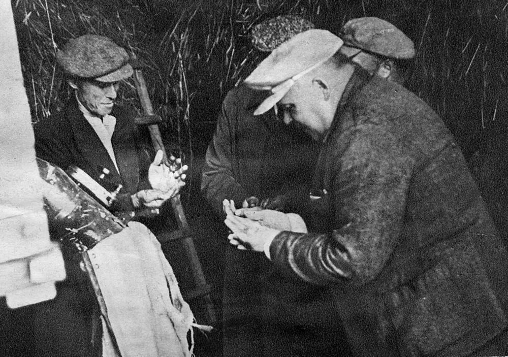 Latvijas Lauksaimniecības kameras priekšsēdētājs Rūdolfs Dzērve un Latvijas Valsts un Ministru prezidents Kārlis Ulmanis iepazīstas ar jauno Amerikas "Case" kuļmašīnu Bērzes Udzes "Pikšu" mājās. Kārlis Ulmanis ar māju saimnieku Vili Ulmani (pa kreisi) apskata graudus.