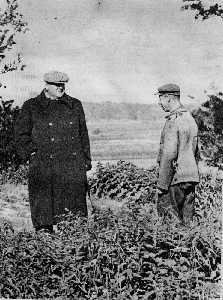 Latvijas Valsts un Ministru prezidents Kārlis Ulmanis, izbraukumā pa Latvijas laukiem, Kalnciemā sarunājas ar Jansonu. Laikraksta fotoreprodukcija.