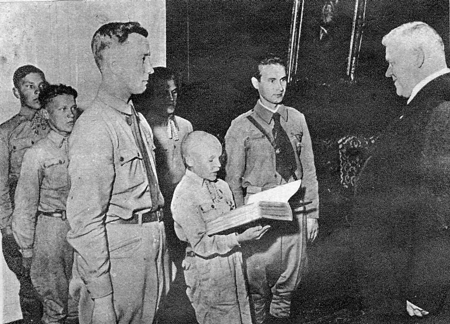 Mazpulku delegācija pasniedz Latvijas Valsts un Ministru prezidentam Kārlim Ulmanim fotoalbumu. Laikraksta fotoreprodukcija.