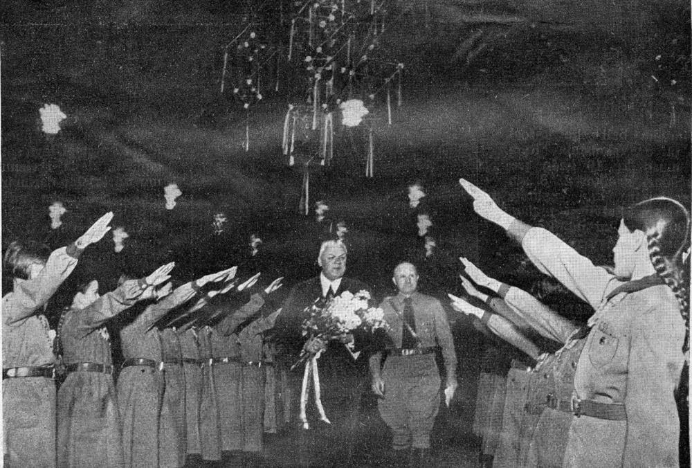 Mazpulku pārstāvju špalera sveic Latvijas Valsts un Ministru prezidentu Kārli Ulmani. Laikraksta fotoreprodukcija.