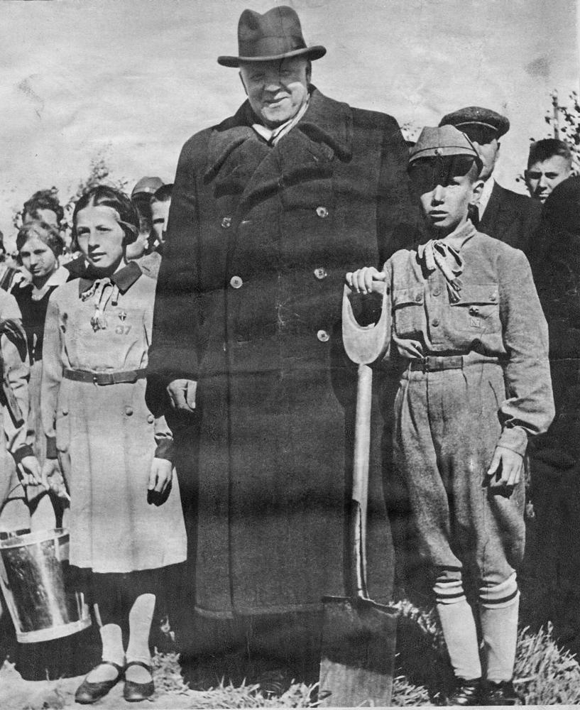 Latvijas Valsts un Ministru prezidents Kārlis Ulmanis mazpulku vidū, Grobiņā. Laikraksta fotoreprodukcija.