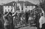 Skolnieku špalera, ar valsts karodziņiem, sveic Latvijas Valsts un Ministru prezidentu Kārli Ulmani, ierodoties Krotes Kronvalda Ata pamatskolas izlaidumā. Fonā skolas ēka (tagad Krote, Bunkas pagasts). 1. rindā no kreisās: 1. Liepājas apriņķa tautskolu inspektors Jānis Graudiņš, 2. Kārlis Ulmanis. Laikraksta fotoreprodukcija.