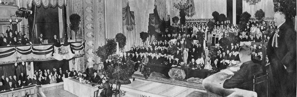 Latvijas Valsts un Ministru prezidents Kārlis Ulmanis piedalās "Zemnieku dienu" svinīgajā sarīkojumā Nacionālajā operā. Ložā klātesošos uzrunā Kārlis Ulmanis. Kreisās puses ložā sēd Latvijas Republikas Valsts prezidents (līdz 11.04.1936) Alberts Kviesis (priekšplānā) un valsts prezidenta adjutants, leitnants Eduards Kuplais (fonā). Laikraksta fotoreprodukcija.