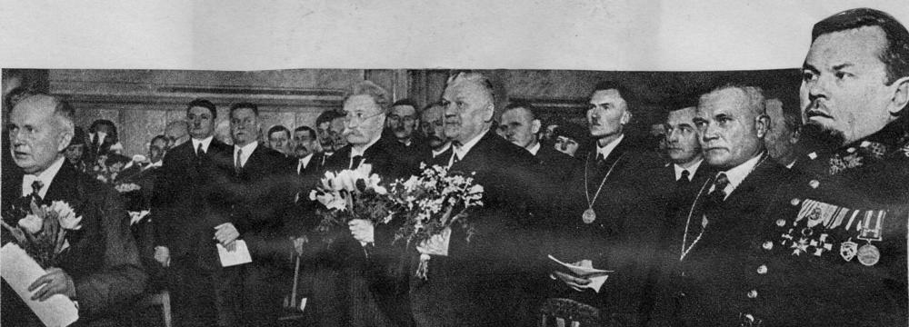 Latvijas Valsts un Ministru prezidents Kārlis Ulmanis piedalās "Zemnieku dienu" svinīgas sēdes atklāšanā, latviešu biedrības namā. Priekšplānā no kreisās Baltijas lauksaimniecības biedrības priekšnieks Hermanis Enzeliņš. 1. rindā no kreisās: 3. izglītības ministrs Augusts Tentelis, 2. Kārlis Ulmanis, 7. Valmieras apriņķa priekšnieks (1931-1938), Valkas apriņķa priekšnieks (1938-1940) Alfrēds Prauliņš. Kolāža. Laikraksta fotoreprodukcija.