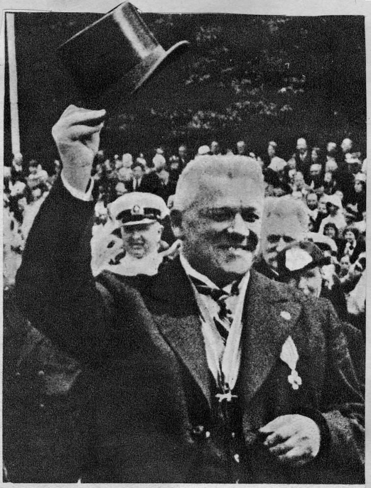 Latvijas Valsts un Ministru prezidents Kārlis Ulmanis atbild uz skautu sveicieniem. Ulmanim kaklā skautu "Pelēkā vilka" lenta un nozīme, kā arī piesprausts Igaunijas skautu organizācijas ordenis. Fonā no kreisās: 1. Jūras krastu aizsardzības eskadras komandieris jūras kapteinis Teodors Spāde, 2. Latvijas Universitātes Filoloģijas un filozofijas fakultātes dekāns (izglītības ministrs 11.07.1935.-21.08.1938.) Augusts Tentelis. Laikraksta fotoreprodukcija.