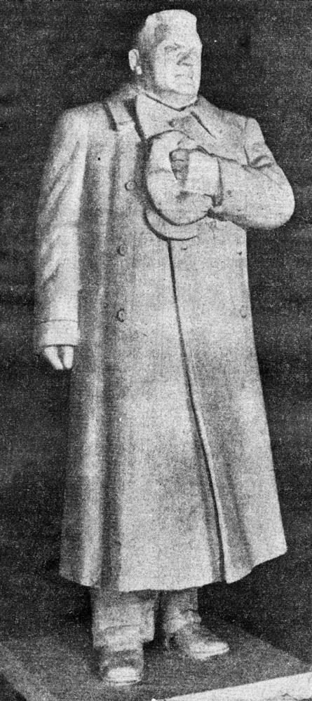 Latvijas Valsts un Ministru prezidenta Kārļa Ulmaņa skulpturālais monuments. Laikraksta fotoreprodukcija.