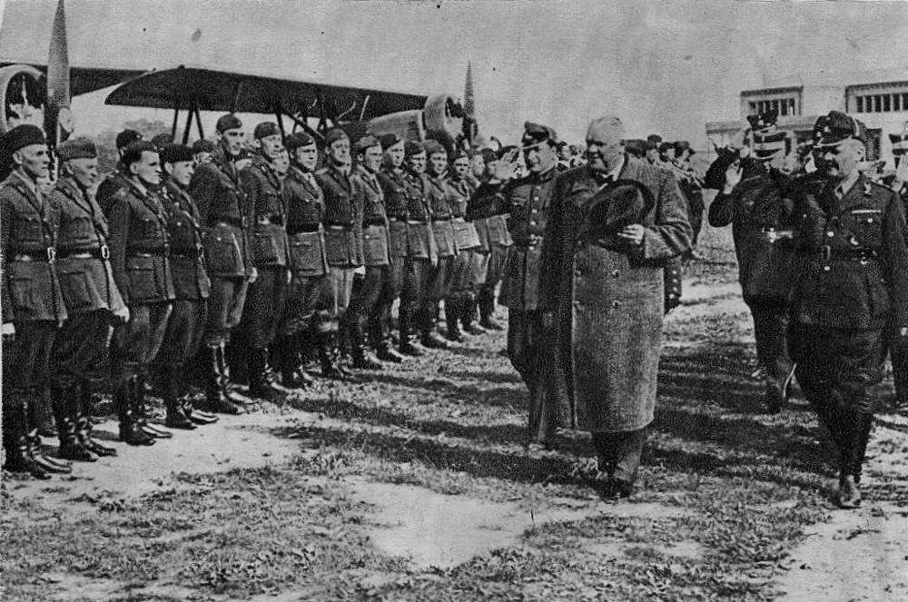 Latvijas Valsts un Ministru prezidents Kārlis Ulmanis pieņem aizsargu aviācijas lidotāju parādi. Priekšplānā no kreisās: 1. Latvijas sabiedrisko lietu ministrs Alfreds Jēkabs Bērziņš, 2. Kārlis Ulmanis, 3. aizsargu aviācijas priekšnieks pulkvežleitnants Jūlijs Ērglis. Laikraksta fotoreprodukcija.