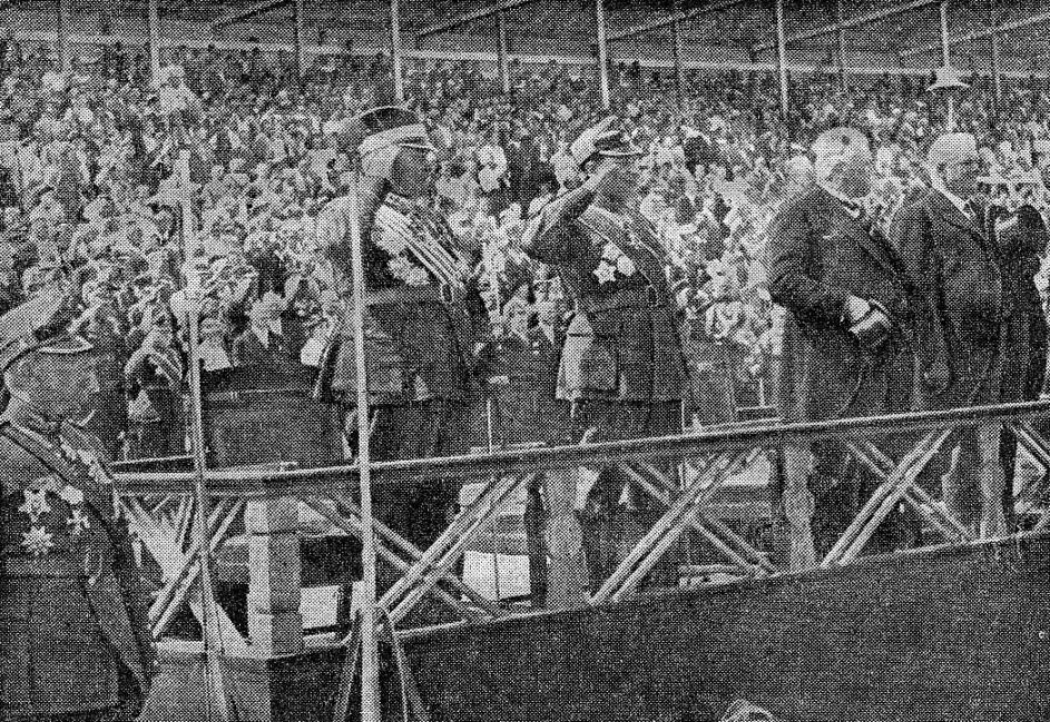Aizsargu organizācijas vadonis un Latvijas Valsts un Ministru prezidents Kārlis Ulmanis pieņem aizsargu lielo parādi. No kreisās: 1. Aizsargu organizācijas priekšnieks, ģenerālis Kārlis Prauls, 2. Latvijas armijas komandieris (14.11.1934.–20.06.1940.) Krišjānis Berķis, 3. Aizsargu štāba organizācijas daļas vadītājs sabiedrisko lietu ministrs (1937-1940) Alfrēds Bērziņš, 4. kara ministrs, ģenerālis Jānis Balodis, 5. Kārlis Ulmanis. Laikraksta fotoreprodukcija.