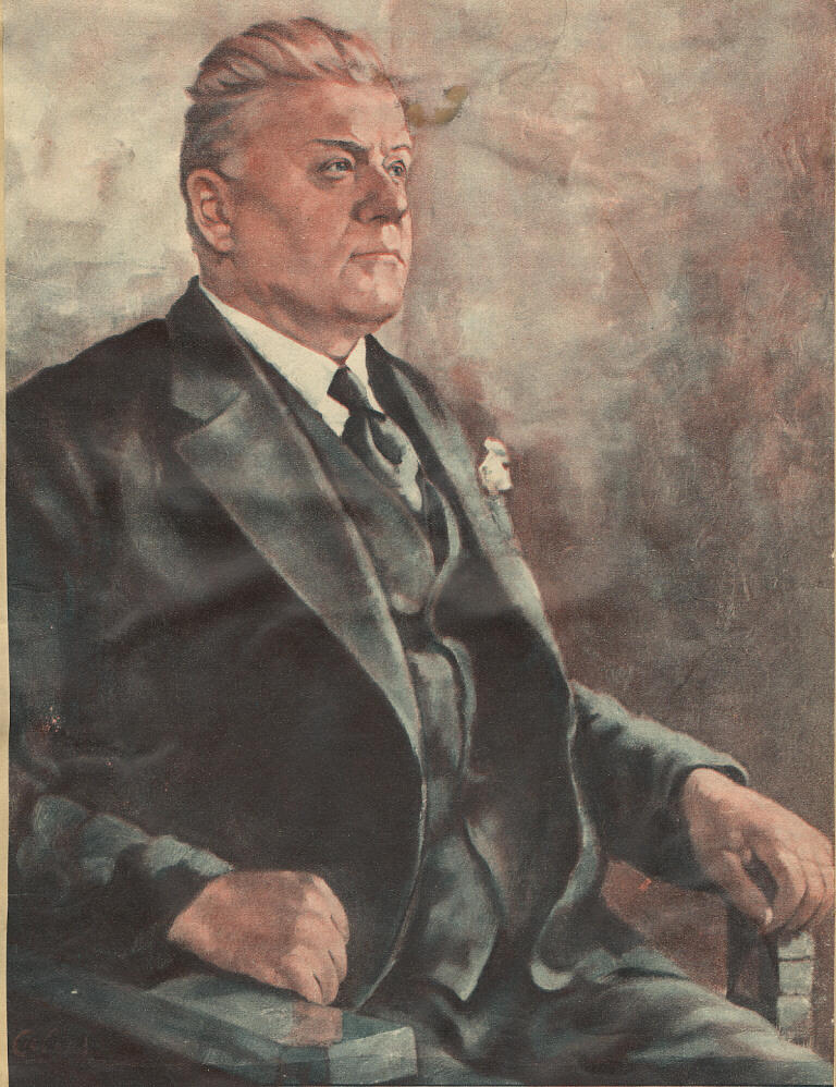 Latvijas Valsts un Ministru prezidents Kārlis Ulmanis mākslinieka Jāņa Cielava portrets. Laikraksta fotoreprodukcija.