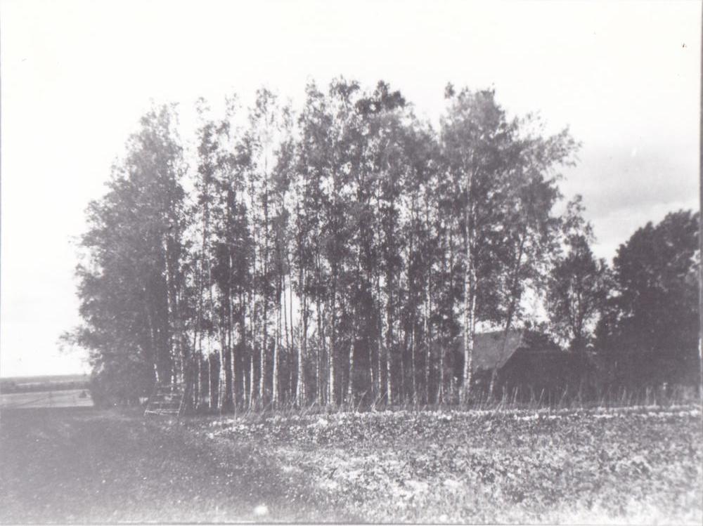 Ainava ar bērzu birzi un dzīvojamo māju.