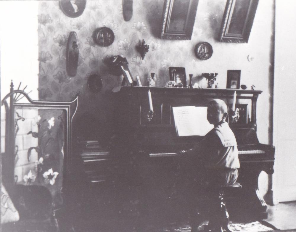 Zēns sēž pie klavierēm. Portrets interjerā.