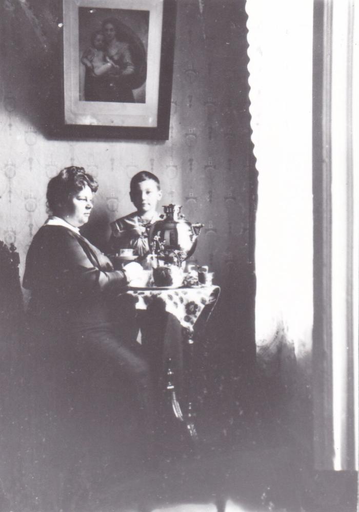 Sieviete ar zēnu dzer tēju. Uz galda stāv patvāris.