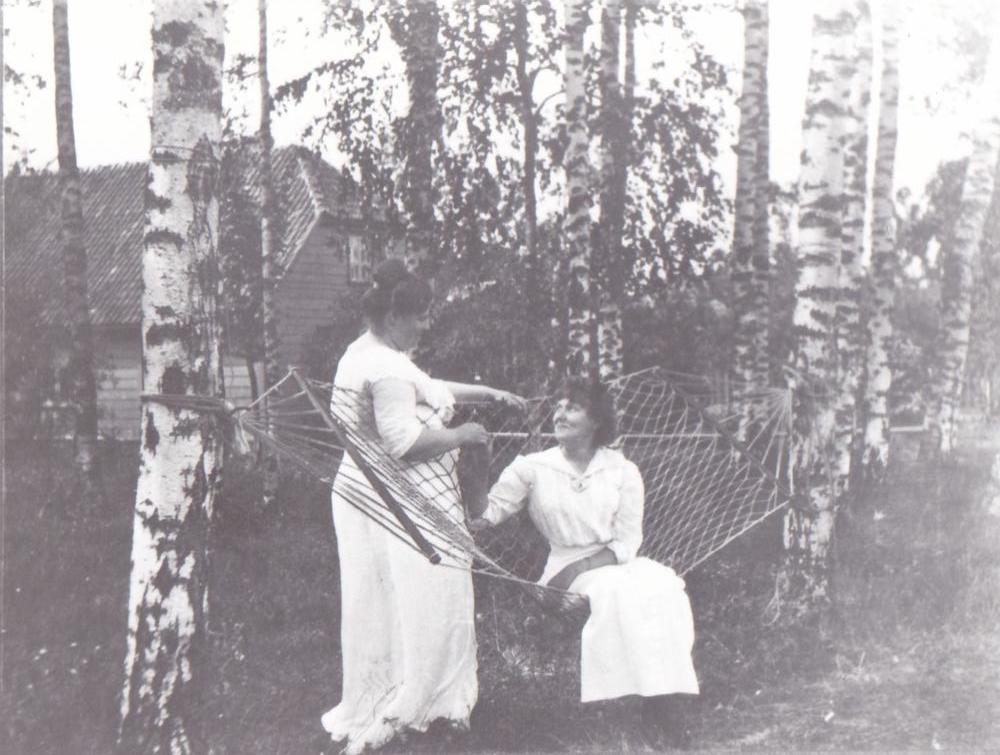 Viena sieviete stāv pie šūpuļtīkla, bet otra tajā ir iesēdusies.