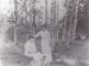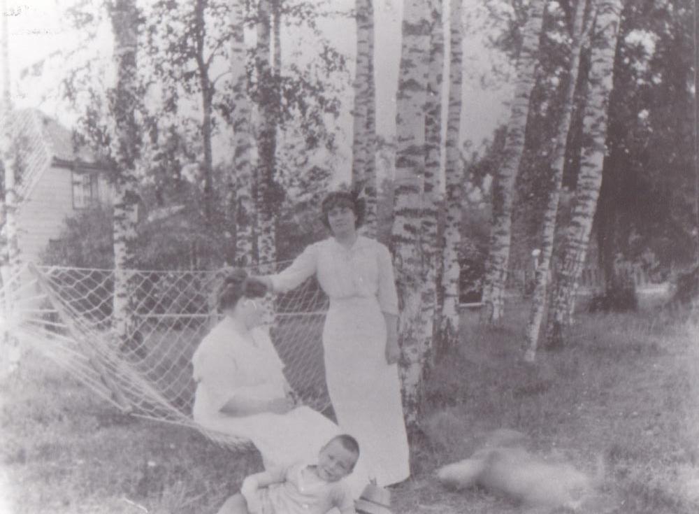 Viena sieviete sēž šūpuļtīklā, bet otra sieviete pie tā stāv. Zēns un suns guļ uz zemes pie šūpuļtīkla.