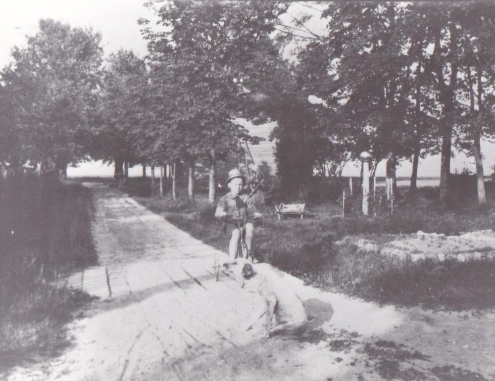 Zēns pagalmā uz trīsriteņa. Uz taciņas sēž suns.