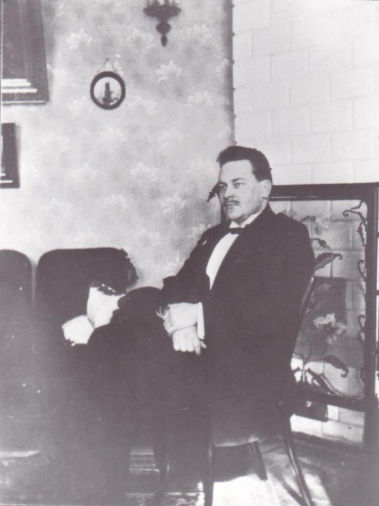 Vīrietis sēž uz krēsla dzīvojamā istabā pie krāsns.