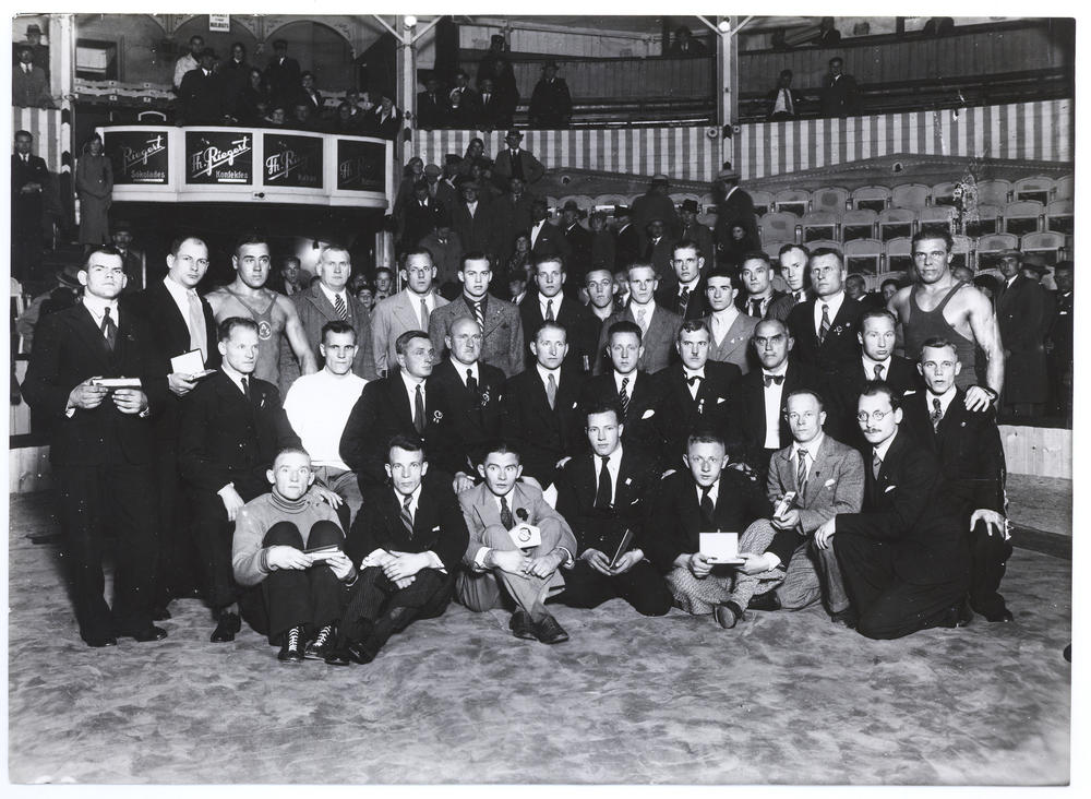 Rīgas 1. atlētikas (atlētu) kluba biedri un citu Latvijas sporta biedrību atlēti Rīgas cirka arēnā pēc sacensībām. No kreisās 2. rindā 8. Kārlis Grauers (?). No kreisās 3. rindā 3. Edvīns Bietags, 14. Rūdolfs Ronis, 15. Alberts Zvejnieks. Pie orķestra ložas redzama T. Riegerta šokolādes fabrikas reklāma.
