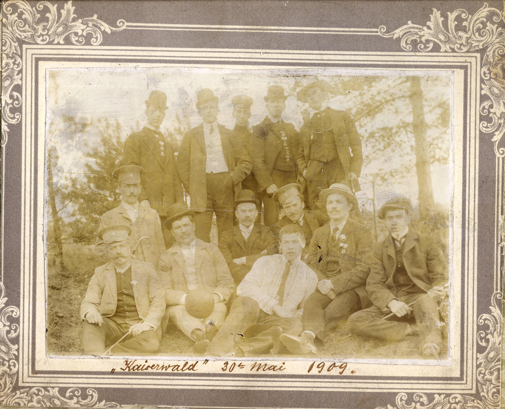 1890. gadā dibinātā 1. Rīgas atlētikas (atlētu) kluba biedri Mežaparkā (1909. gadā Kaiserwald). Grupas foto.