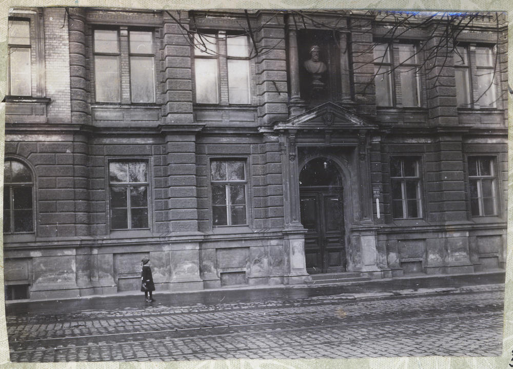 Skats uz Rīgas Valsts tehnikuma ēkas ieejas portālu Krišjāņa Valdemāra ielā 1c. No 1891. līdz 1919. gadam ēkā atradās Rīgas Nikolaja ģimnāzija, no 1919. gada Rīgas Valsts tehnikums.