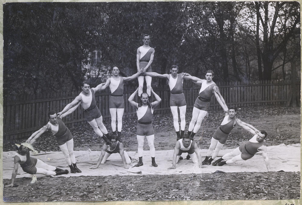 Skats uz 1890. gadā dibinātā 1. Rīgas atlētikas (atlētu) kluba biedru izveidoto akrobātisko piramīdu.