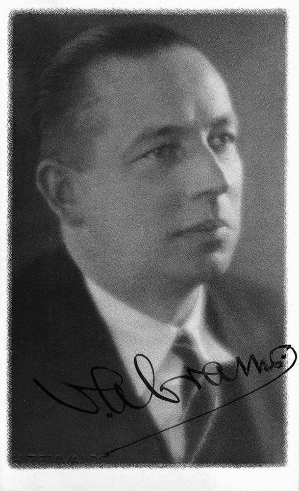 Aktieris, režisors Voldemārs Ābrams. Portrets ar autogrāfu. Strādājis Ziemeļlatvijas teātrī (tagad Valmieras Drāmas teātris), Latgales teātrī u.c. teātros, bija brīvdabas uzvedumu režisors Rīgā, Dailes teātra galvenais administrators.