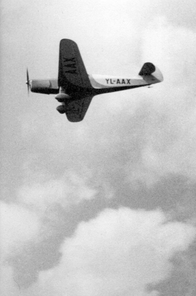 Kārļa Irbīša konstruētā un Valsts elektrotehniskajā fabrikā (VEF) 1936. gada vasarā uzbūvētā divvietīgā sporta un ceļojumu lidmašīna "VEF I-11", kura pēc lidspējas pārbaudes saņēma reģistrācijas burtus YL-AAX, lidojumā virs Rīgas gaisa ostas lidlauka Spilvē.