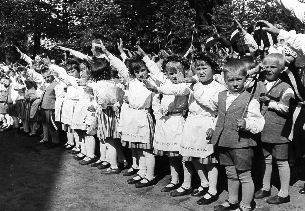 Bērnu svētki Arkādijas parkā, Torņakalnā. Latvijas Valsts un Ministru prezidenta Kārļa Ulmaņa sagaidīšana, svinīgā bērnu špalera.