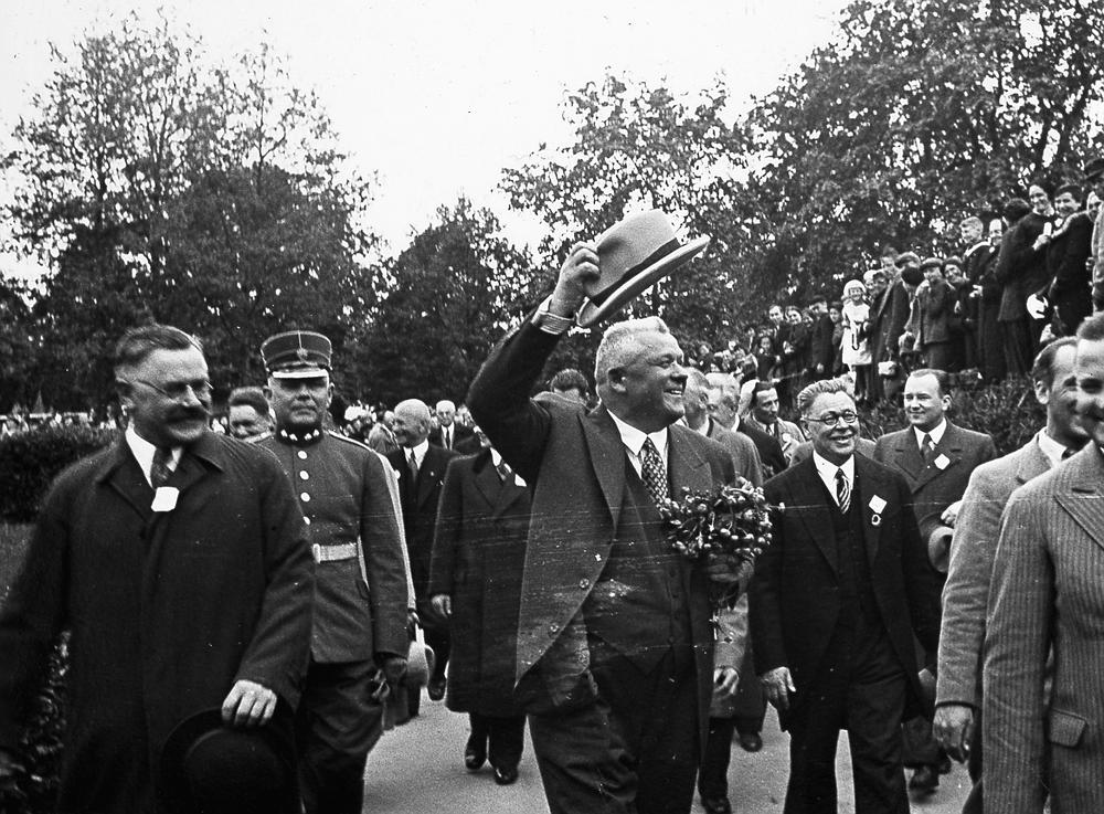 Bērnu svētki Arkādijas parkā, Torņakalnā. Latvijas Valsts un Ministru prezidents Kārlis Ulmanis ierodas Arkādijas parkā. 1. rindā no kreisās: 1. Izglītības ministrijas tautskolu direktors Mārtiņš Soste, 2. Kārlis Ulmanis, 3. Arkādijas laukuma komandants - skolotājs Lūsis. 2. rindā no kreisās: 1. Rīgas pilsētas prefekts Teodors Grīnvalds, 2. svētku prezidija priekšsēdētājs - Rīgas pilsētas Izglītības valdes priekšnieks Andrejs Vičs.