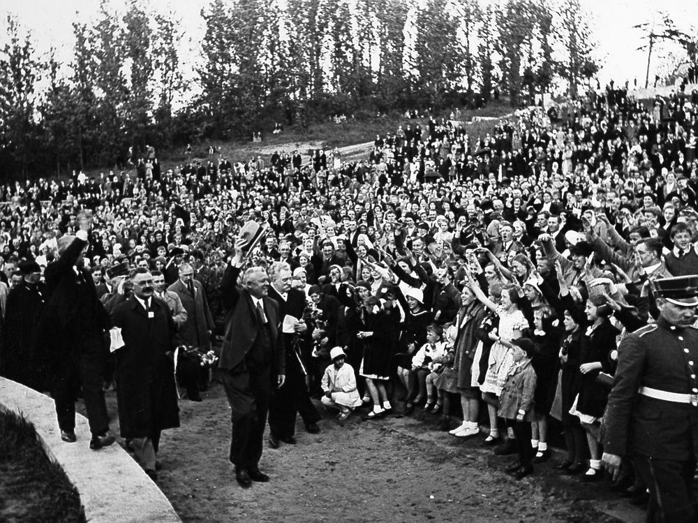 Bērnu svētki Arkādijas parkā, Torņakalnā. Latvijas Valsts un Ministru prezidents Kārlis Ulmanis (priekšplānā) ierodas Arkādijas parkā. 1. rindā no kreisās: 1. svētku prezidija priekšsēdētājs - Rīgas pilsētas Izglītības valdes priekšnieks Andrejs Vičs, 2. Izglītības ministrijas tautskolu direktors Mārtiņš Soste, 3. izglītības ministrs Augusts Tentelis.
