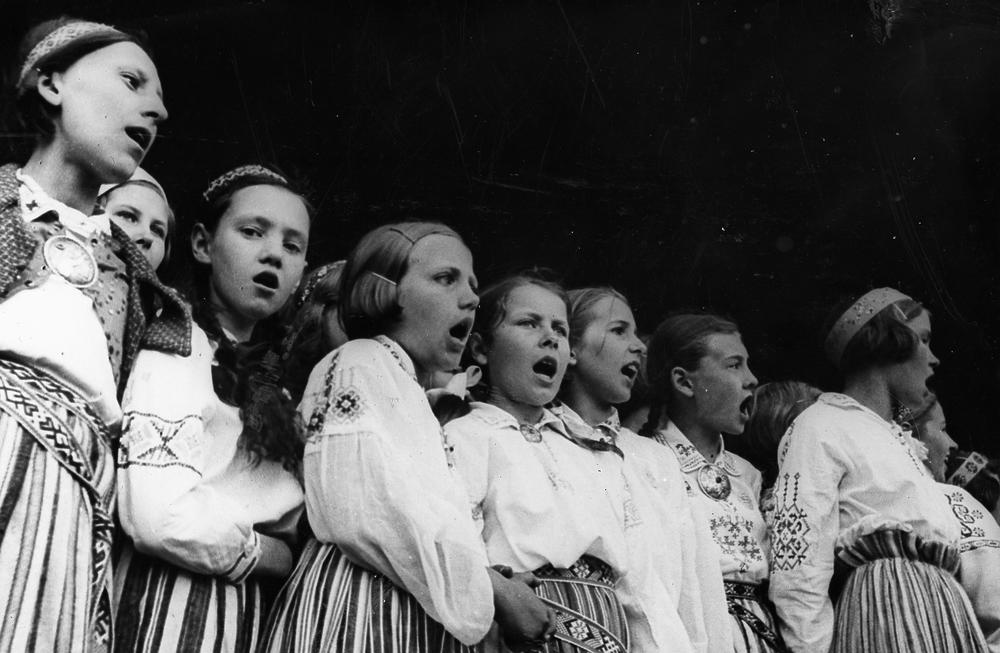 Bērnu svētki Arkādijas parkā, Torņakalnā. Tautastērpos dzied mazās koristes.
