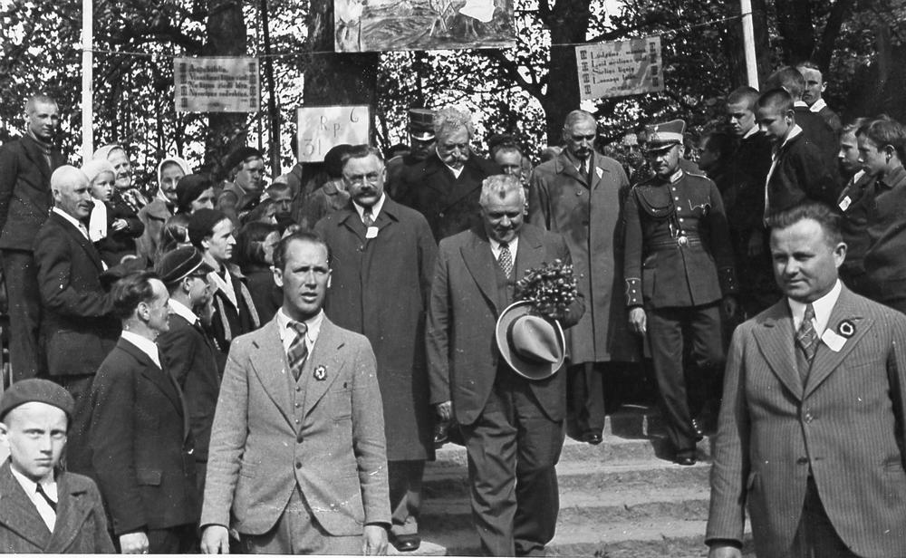 Bērnu svētki Arkādijas parkā, Torņakalnā. Goda viesi apskata "Darba stūrīti", kur noformējumam izmantotas tautasdziesmas. Priekšplānā no labās 1. Arkādijas laukuma komandants - skolotājs Lūsis. No kreisās: 1. Izglītības ministrijas tautskolu direktors Mārtiņš Soste, 2. Latvijas Valsts un Ministru prezidentu Kārlis Ulmanis. 2. rindā no kreisās: 1. izglītības ministrs Augusts Tentelis, 3. Latvijas Ministru prezidenta Kārļa Ulmaņa adjutants pulkvežleitnants Miervaldis Lūkins.