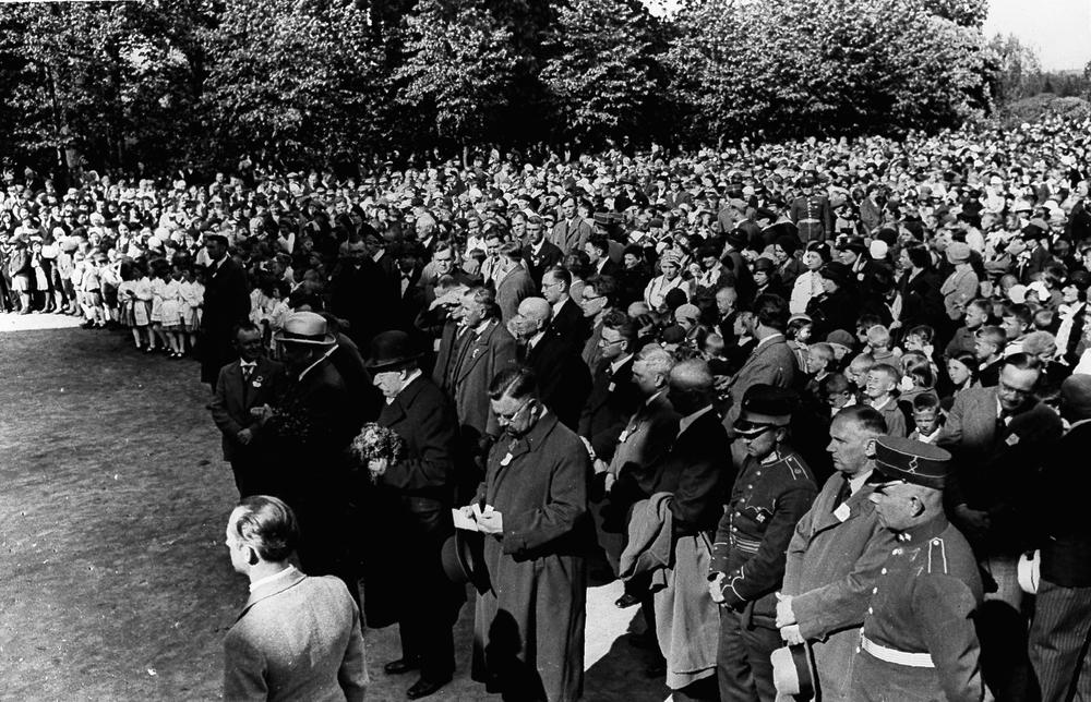 Bērnu svētki Arkādijas parkā, Torņakalnā. Goda viesi un svētku dalībnieki noklausās kora dziesmas. 1. rindā no kreisās: 2. Latvijas Valsts un Ministru prezidentu Kārlis Ulmanis, 3. izglītības ministrs Augusts Tentelis, 4. Izglītības ministrijas tautskolu direktors Mārtiņš Soste. 2. rindā no labās: 3. Latvijas Ministru prezidenta Kārļa Ulmaņa adjutants pulkvežleitnants Miervaldis Lūkins, 6. Kārļa Ulmaņa sekretārs Jānis Cimmermanis (no 1939. gada Rudums), 7. svētku tehniskais vadītājs - Izglītības ministrijas fiziskās audzināšanas inspektors Voldemārs Cekuls, 8. svētku sekretārs - Rīgas 43. pamatskolas pārzinis E. Dēliņš (?).