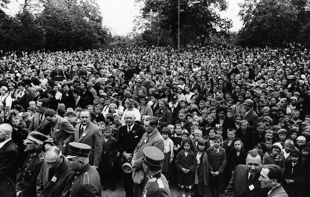 Bērnu svētki Arkādijas parkā, Torņakalnā. Goda viesi un svētku dalībnieki svētku laukumā. 1. rindā no kreisās 2. Latvijas Ministru prezidenta Kārļa Ulmaņa adjutants pulkvežleitnants Miervaldis Lūkins. 2. rindā no labās 3. svētku tehniskais vadītājs - Izglītības ministrijas fiziskās audzināšanas inspektors Voldemārs Cekuls.