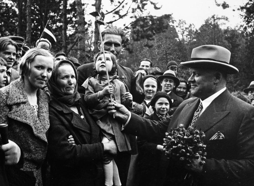 Bērnu svētki Arkādijas parkā, Torņakalnā. Latvijas Valsts un Ministru prezidentu Kārlis Ulmanis (1. no labās) ar saulpureņu pušķi, dāvājot papīra vējdzirnaviņas, atvadās no mazākās svētku dalībnieces Klaudijas Ivanovas.