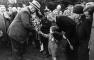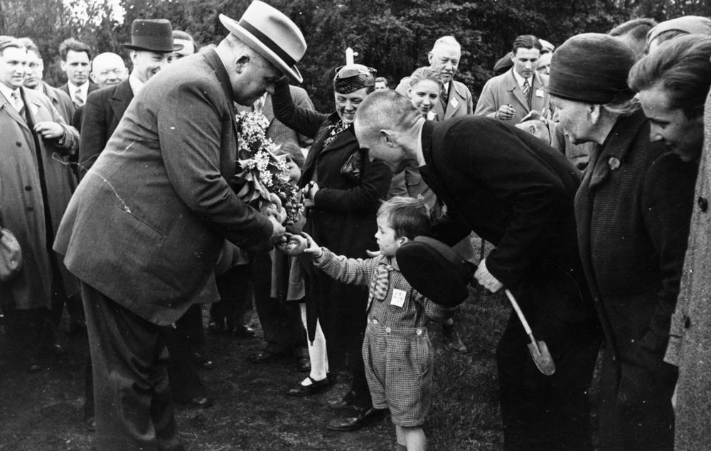 Bērnu svētki Arkādijas parkā, Torņakalnā. Latvijas Valsts un Ministru prezidentu Kārlis Ulmanis (priekšplānā no kreisās) atvadās no mazākā svētku dalībnieka, uzdāvinot kilņģerīti. 2. rindā no kreisās 2. svētku tehniskais vadītājs - Izglītības ministrijas fiziskās audzināšanas inspektors Voldemārs Cekuls.